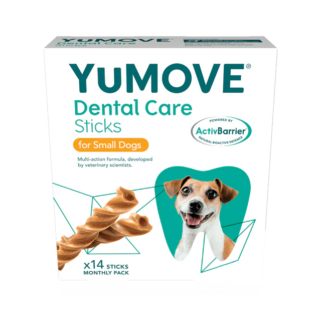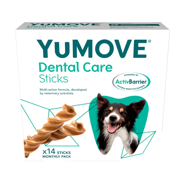 NEW multi-action YuMOVE Dental Care Sticks for dogs are an innovative dental regime, developed by veterinary scientists to target plaque, freshen breath, and create a barrier along the teeth and gums helping preventing future gum health concerns. The fast-acting formula means you can expect to notice a difference in your dog’s mouth in just 4 weeks.